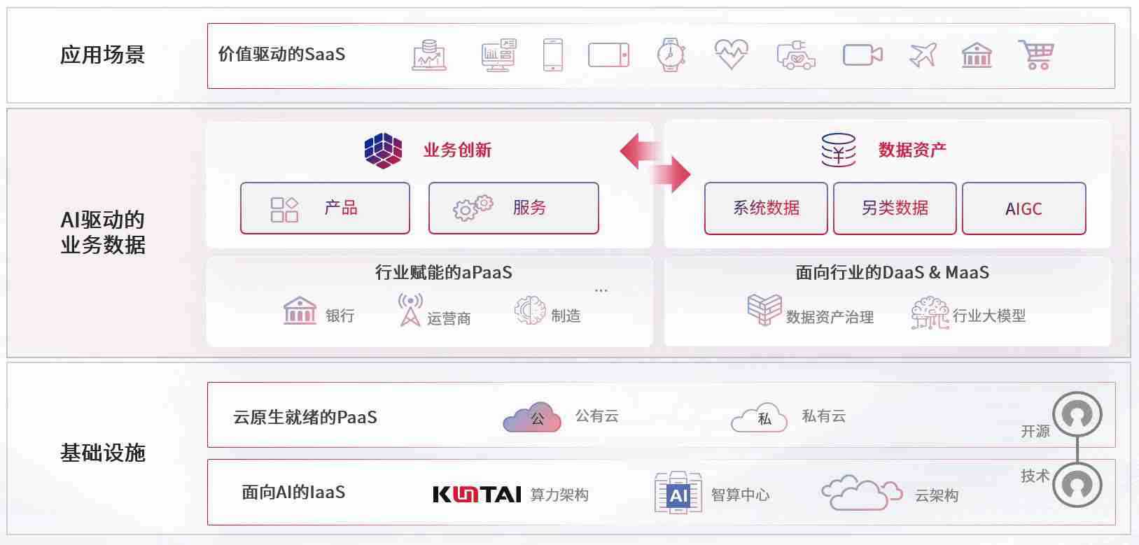 数字时代,,,围绕企业数字化转型的关键要素,,TOP1体育数码开创性的提出数云融合战略和技术体系框架,,,着力在云原生、、数字原生、、AI原生和信创产业上架构产品和服务能力,,,,为处在不同数字化转型阶段的快消零售、、汽车、、、、金融、、、、医疗、、政企、、教育、、运营商等行业客户提供泛在的敏捷IT能力和融合的数据驱动能力,,,,构建跨界融合创新的数字业务场景和新业务模式,,,,助力企业级客户建立面向未来的核心能力和竞争优势,,,全面推动社会的数字化、、智能化转型升级。。。